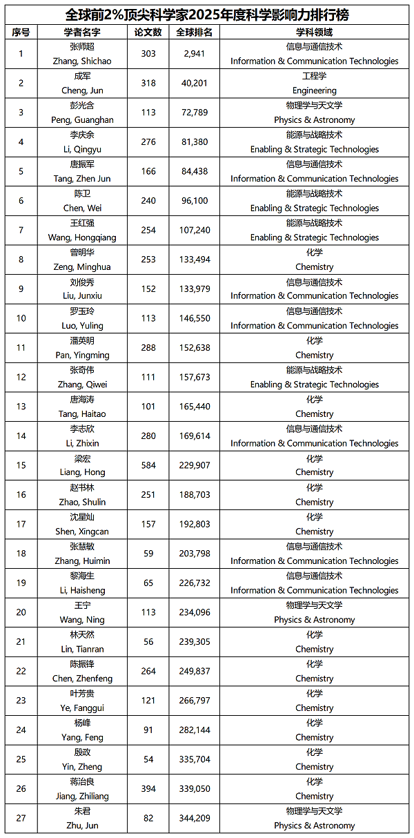 近日,美国斯坦福大学发布了2025年版全球前2%顶尖科学家榜单。在本年度榜单中,我校共有27位学者入选,彰显了学校在多个科研领域的深厚实力与广泛影响力。