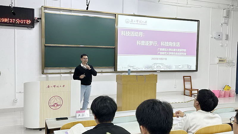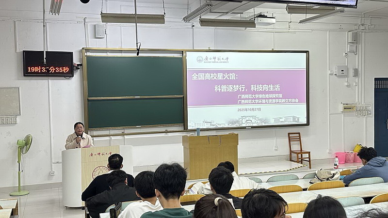 正值金秋十月,恰逢全国高校星火馆与科技活动月同步推进,一场关于“超级细菌”微观奥秘与“逐梦高手”成长攻略的讲座,将碰撞出怎样的思维火花?2025年10月27日晚上,由广西师范大学绿色地球探究馆与环境与资源学院教立方协会联合主办的“科普逐梦行,科技向生活”主题讲座在雁山校区成功举行。本次活动由环境与资源学院的蒋瑜副教授、卢宇翔讲师主讲,陈朝述高级实验师主持,面向学院2024级和2025级本科生,以讲座的形式,带来一场知识与梦想的盛宴。