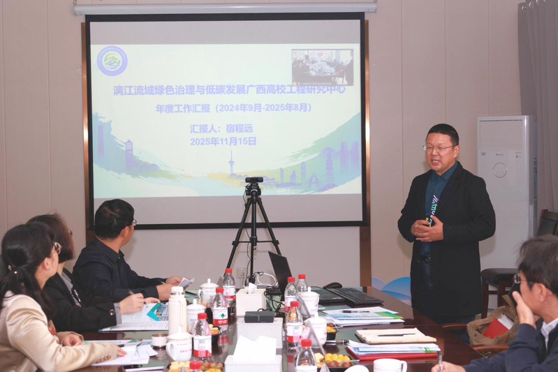 为深入学习贯彻落实习近平总书记关于生态文明建设的重要论述精神,积极服务国家碳达峰碳中和重大战略部署及广西生态文明强区建设需求,着力提升我校在流域绿色治理与低碳发展领域的科技创新与决策支撑水平,2025年11月15日上午,我院于雁山校区理四424会议室举办“学科攀登计划”暨“科研活动月”系列活动——漓江流域绿色治理与低碳发展广西高校工程研究中心(以下简称“工程研究中心”)发展2025年度技术委员会会议。工程研究中心技术委员会主任中山大学孟凡刚教授,技术委员会委员广西国宏智鸿环保科技集团有限公司副总经理邹清川、中国有色桂林矿产地质研究院有限公司谢廷勇教授级高级工程师、学院于方明教授等,工程研究中心主任宿程远教授,学校科学技术处副处长蒋丽萍、学校创新创业学院副院长罗元,学院主要领导及工程研究中心骨干成员等参加本次会议。